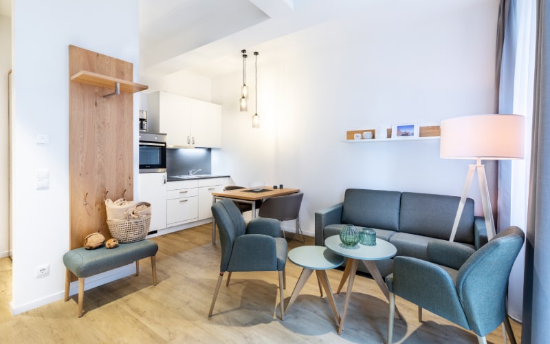 Alle Apartments verfügen über WLAN, Fußbodenheizung sowie eine hochwertige Einrichtung und Ausstattung. Das harmonische Farbkonzept vermittelt Wohlgefühl und moderne Gemütlichkeit. Die Ferienanlage bietet einen Fahrstuhl sowie Waschmaschine und Trockner für die Reisewäsche. Die Aufzugsanlage ermöglicht eine barrierearme und komfortable Erreichbarkeit der Apartments. Darüber hinaus steht euch ein Brötchenservice zur Verfügung – einfach an der Rezeption bestellen und am nächsten Morgen im Living Room des Krusespeichers abholen. Dort findet ihr außerdem Automaten für Kaffeespezialitäten, Frühstückszutaten und Snacks.
