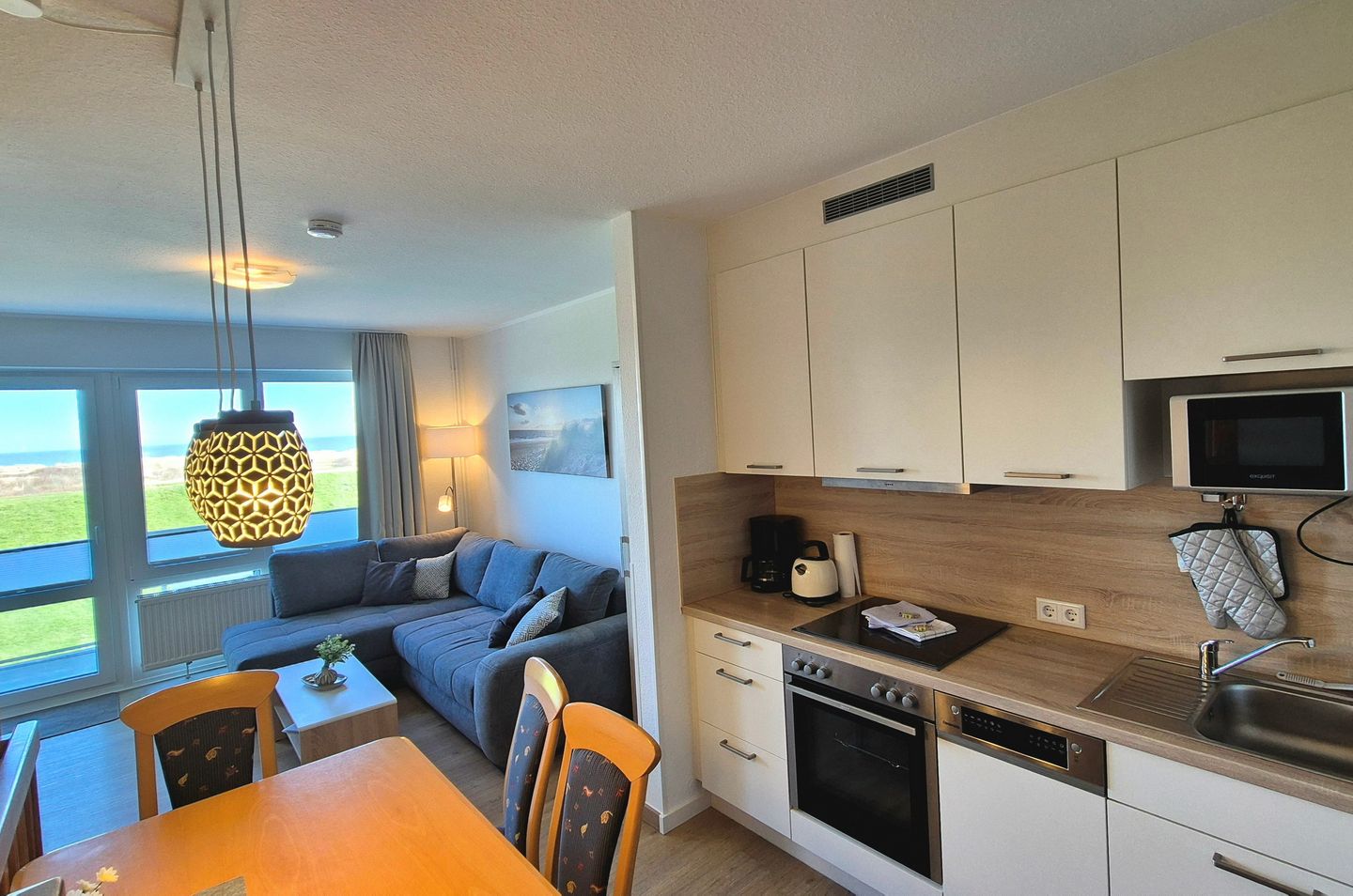 Auf der mittleren Wohnebene, im zweiten Obergeschoss, befindet sich die offene, voll ausgestattete Küche mit Essbereich und angrenzendem Abstellraum, Geschirrspüler, Kühlschrank, Gefrierfach, 4-Felder Ceranherd, Backofen, Kaffeefiltermaschine, Kaffeekapselmaschine (Nespresso), Eierkocher, Toaster, Wasserkocher und Mikrowelle. Hier liegt auch der Wohnbereich und der Balkon mit wunderschönem Blick zum Deich und zum Meer. Der Wohnbereich beinhaltet eine Schlafcouch (1,40 x 1,80 m) und bietet euch einen Flatscreen-TV sowie Gesellschaftsspiele und Bücher. Alle Schlaf- und Wohnräume sind mit Verdunkelungsgardinen ausgestattet. Die Wohnung verfügt über kostenfreies WLAN.