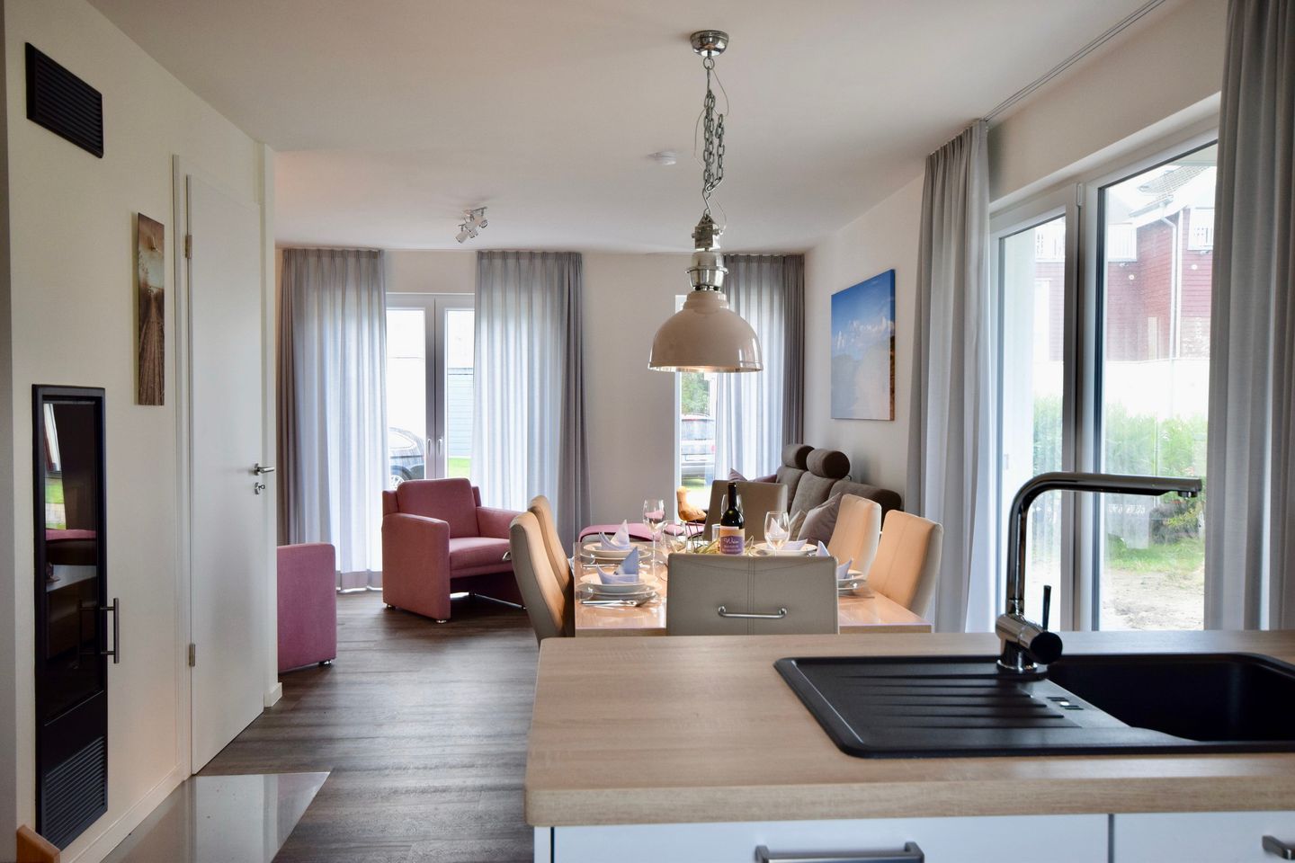 Das geschmackvolle und helle Nichtraucher-Ferienhaus verfügt über Fußbodenheizung, kostenfreies WLAN und bodentiefe Fenster. Im Erdgeschoss befindet sich die moderne und voll ausgestattete offene Küche mit Kaffeevollautomat, Kaffeefiltermaschine, Geschirrspülmaschine, 4-Felder Ceranherd und Backofen, Mikrowelle, Toaster, Wasserkocher und Kühlschrank mit Tiefkühlfach. Im kombinierten Wohn-Essbereich stehen euch ein großer SMART-TV (45 Zoll) und ein Kamin zur Verfügung (Kaminholz ist nicht inbegriffen). Sowohl der Esstisch, als auch der behagliche Sitzbereich bieten euch viel Platz, um gesellige Stunden mit der Familie oder Freunden nach einem schönen Tag am Strand zu verbringen. Bereits beim Frühstück könnt ihr auf der großzügigen und südlich gelegenen Terrasse die idyllische Lage genießen. Die Terrasse verfügt über Gartenmöbel-Möbel und Sonnenschirm und ist vom Wohnbereich aus begehbar.