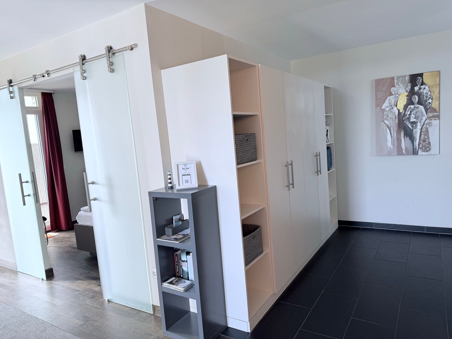Das moderne Nichtraucher-Apartment verfügt über kostenfreies WLAN und eine voll ausgestattete offene Küche mit Geschirrspüler, Kaffeemaschine, Toaster, Wasserkocher, Tiefkühlfach, Mikrowelle und Backofen. Im Schlafzimmer stehen euch ein Doppelbett (1,80 x 2,00 m) und ein Flatscreen-TV, im Wohnbereich ein weiterer Flatscreen-TV, eine HiFi-Anlage, Telefon und ein Elektrokamin zur Verfügung. Im Eingangsbereich befindet sich ein großer Kleiderschrank mit viel Stauraum.