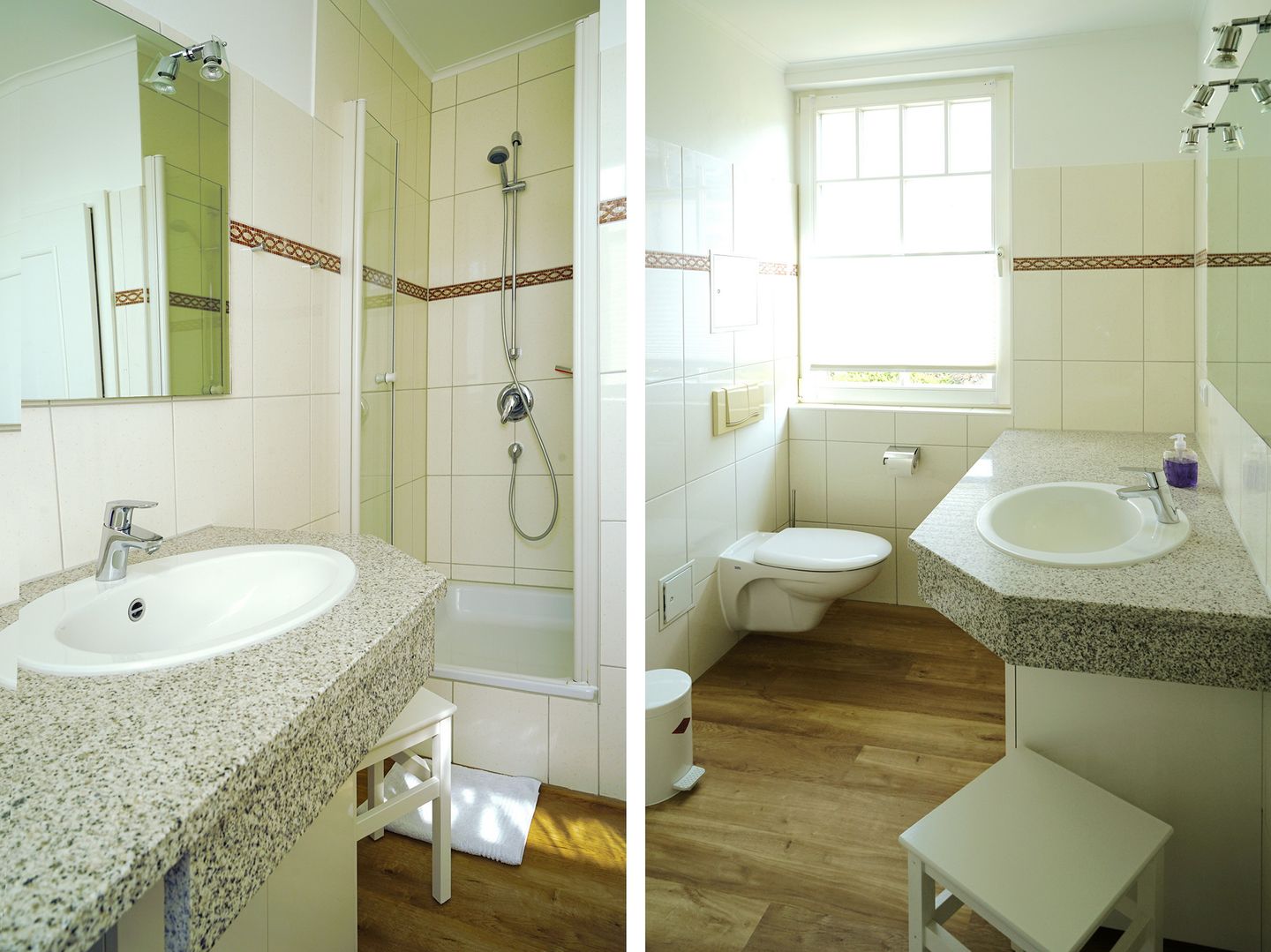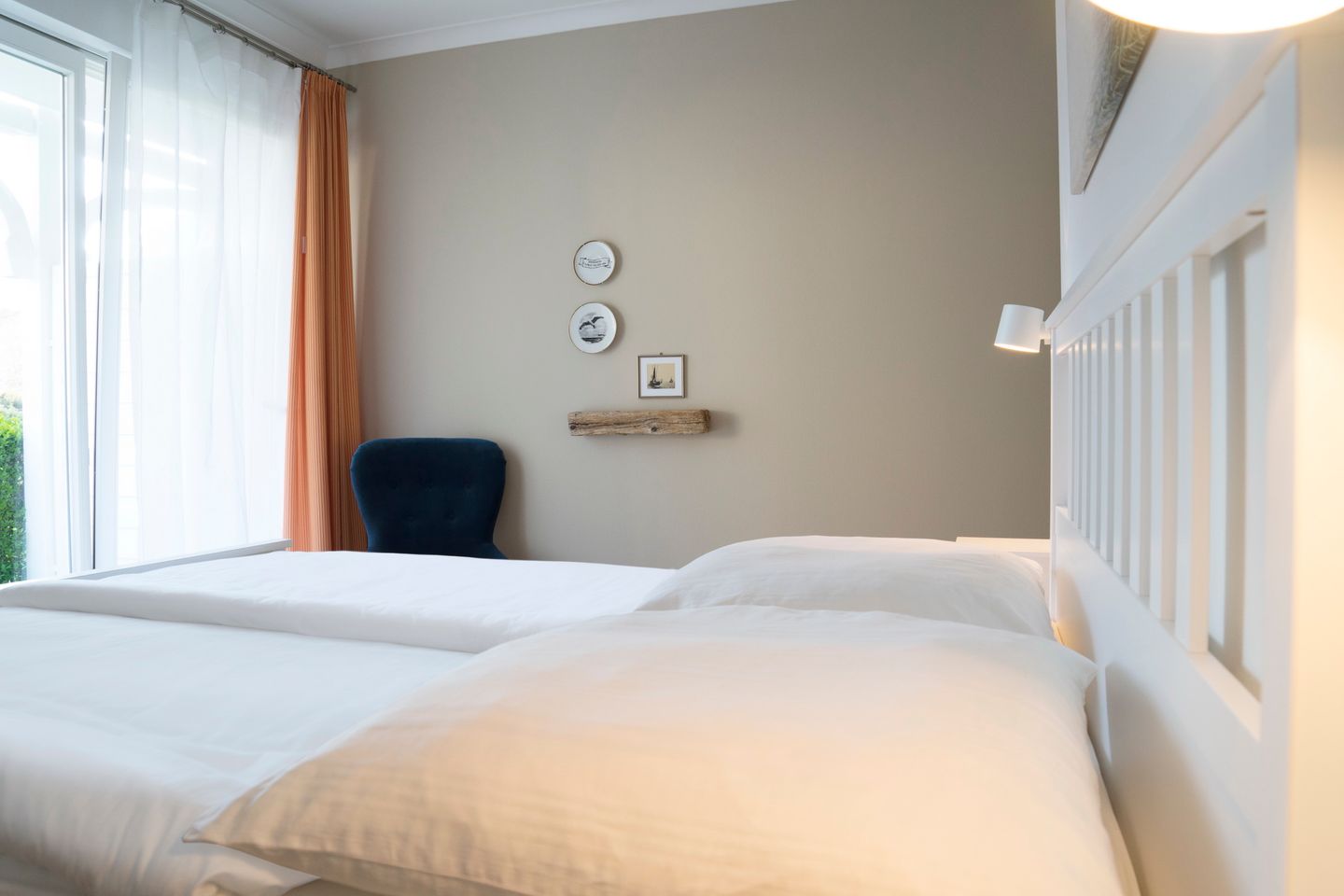 Das geschmackvolle Nichtraucher-Apartment bietet eine voll ausgestattete offene Küche mit Geschirrspülmaschine, Mikrowelle, Backofen, Ceranfeld, Toaster, Kaffeemaschine, Wasserkocher und Kühlschrank mit Tiefkühlfach. Im kombinierten Wohn- und Essbereich steht euch eine Mini-HiFi-Anlage mit Bluetooth, USB und Audiozugang sowie ein Flatscreen-TV zur Verfügung. Sowohl der Esstisch, als auch der behagliche Sitzbereich bieten euch viel Platz, um schöne Stunden beim Frühstück oder nach einem ereignisreichen Tag am Strand mit der ganzen Familie oder Freunden zu verbringen. Zwei separate und liebevoll eingerichtete Schlafzimmer, ausgestattet mit einem großen Doppelbett bzw. zwei Einzelbetten, bieten Platz für 4 Personen. Das Schlafzimmer mit Doppelbett (1,60 x 2,00) verfügt über einen Lesesessel und hat direkten Zugang zur großen Westterrasse. Ein Kinderbett kann gegen Entgelt aufgestellt werden und auf Wunsch könnt ihr gerne einen Hochstuhl hinzubuchen. Bereits beim Frühstück könnt ihr auf der nach Osten gelegenen Terrasse die Morgensonne begrüßen; bis zum Abend lockt die große und sonnig gelegene West-Terrasse. Das großzügige Badezimmer mit Tageslicht, Granit-Waschtisch mit großem Spiegel, Dusche und WC verfügt über Kosmetikspiegel und Föhn. In einem kleinen Abstellraum befinden sich Wäscheständer und Bügelbrett.