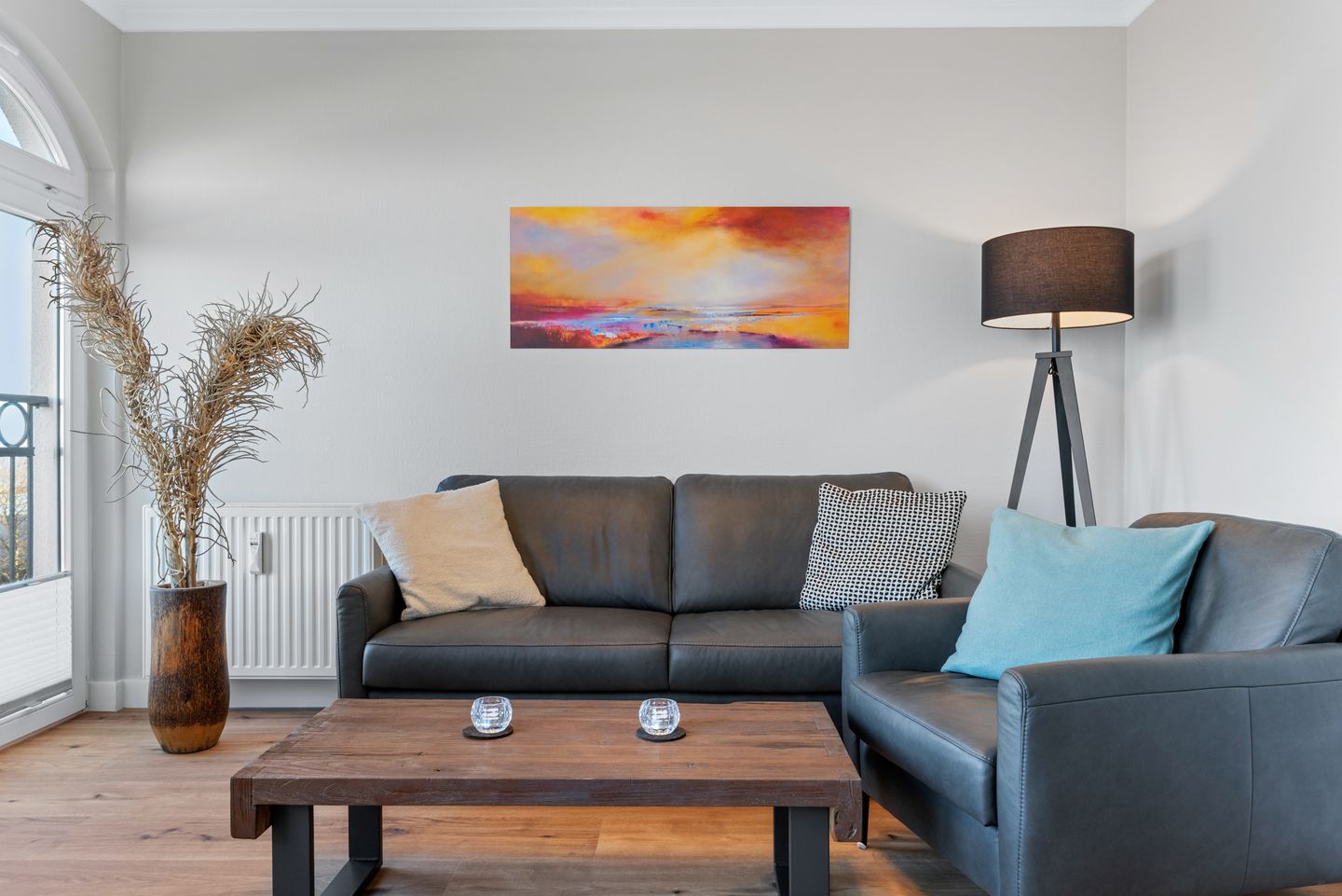 Das helle Apartment überzeugt durch seine hochwertige und moderne Ausstattung. Es verfügt über zwei Schlafzimmer, eines mit Boxspring-Doppelbett und eines mit Boxspring-Einzelbett. Beide Schlafzimmer liegen ruhig zur Hofseite; das Elternschlafzimmer ist zusätzlich mit einem 43-Zoll-Flachbild-TV ausgestattet.