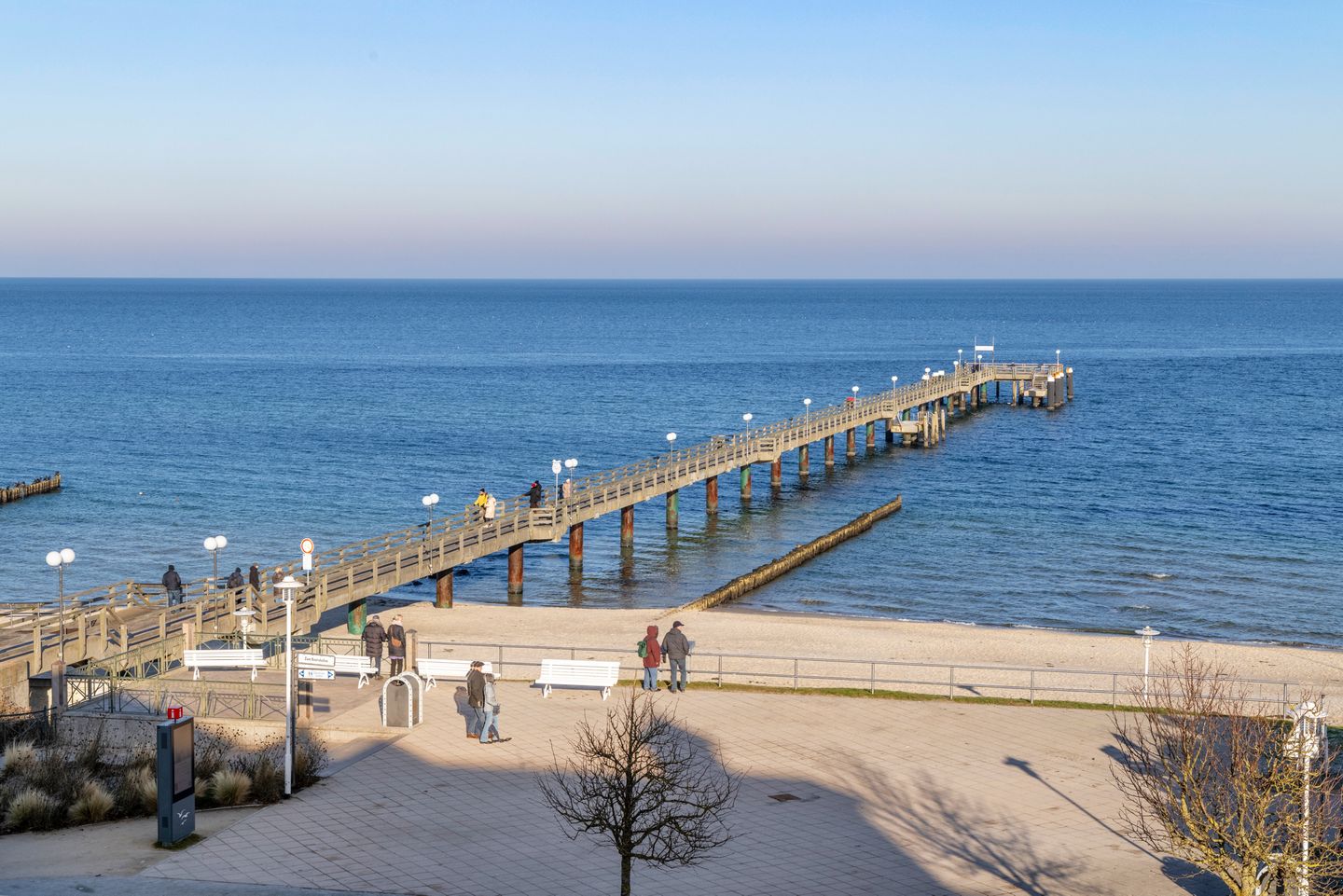 Die komfortable Ferienwohnung befindet sich im 3. Obergeschoss auf der Seeseite der Anlage und liegt unmittelbar am feinsandigen Strand von Kühlungsborn. Vom Balkon aus genießt ihr einen freien Blick auf die Ostsee, den Strand und die Seebrücke – perfekte Voraussetzungen für entspannte Urlaubstage direkt am Meer.
