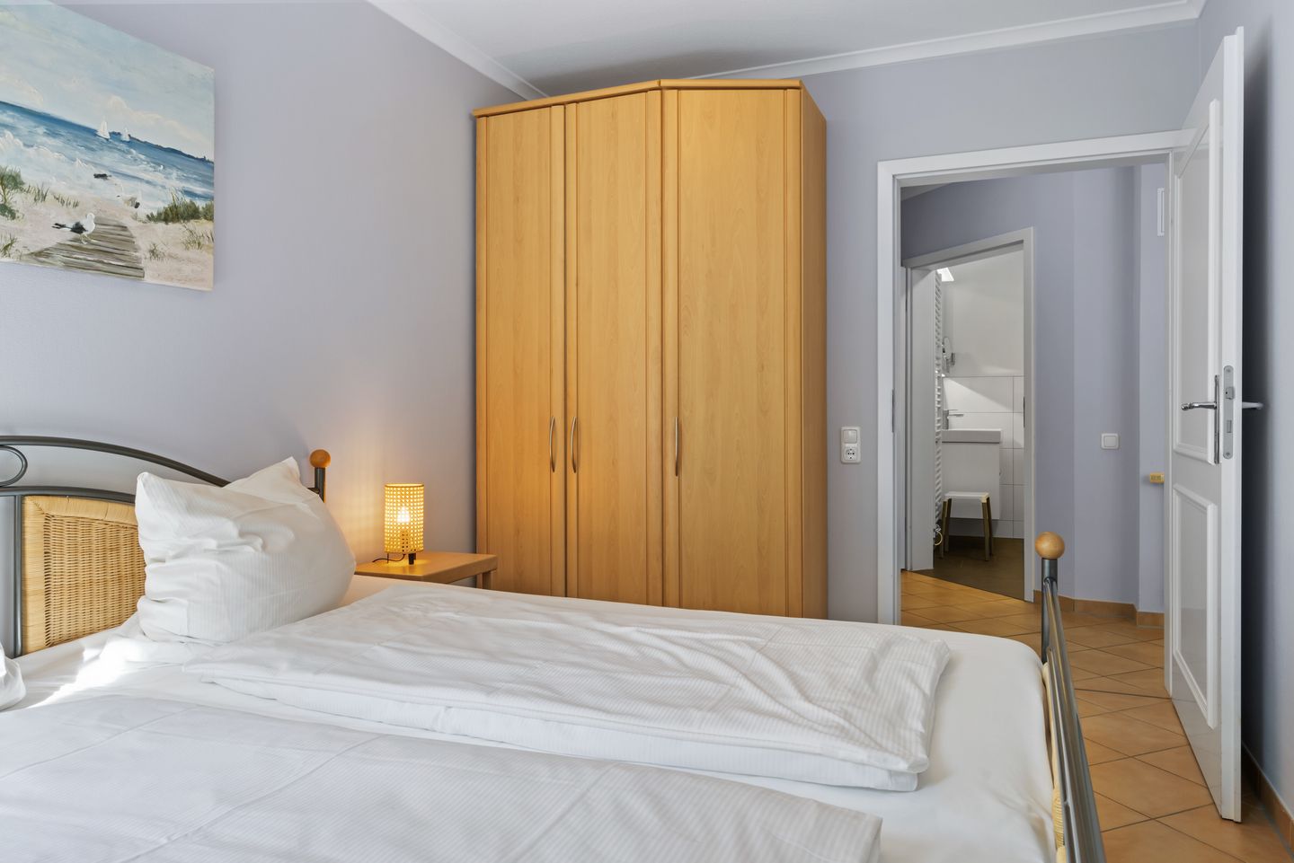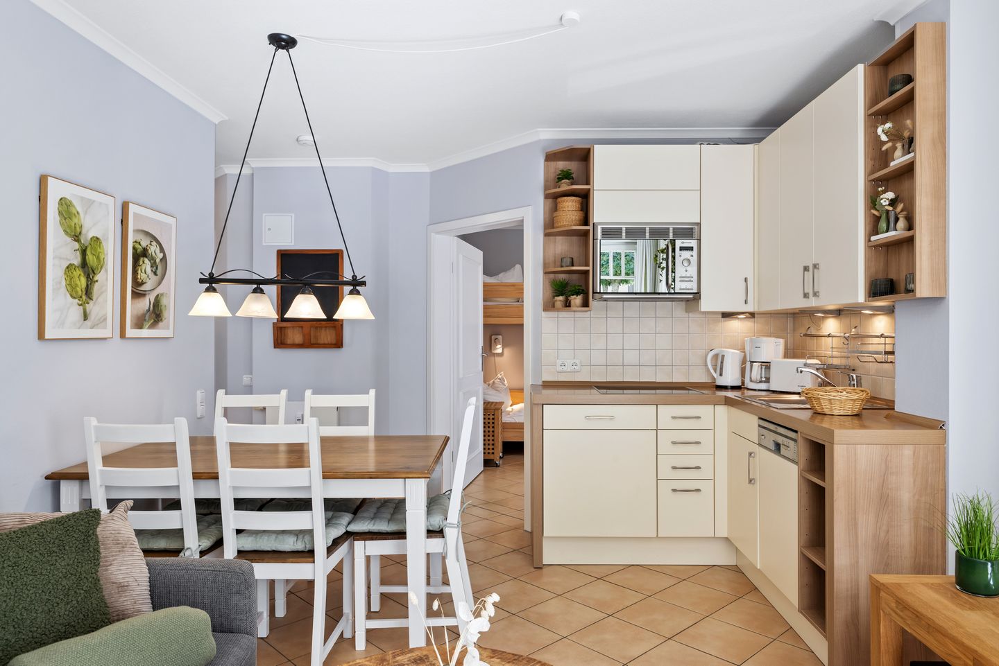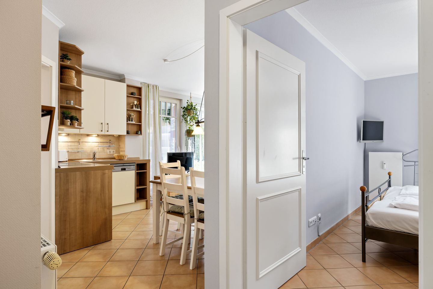 Der Komfort des durchgängig gefliesten Nichtraucher-Apartments ergibt sich aus einem Schlafzimmer mit einem Doppelbett und Fernseher sowie ein weiteres Schlafzimmer mit einem Etagenbett. Ein Wohnbereich mit Schlafcouch und Fernseher und angrenzender Terrasse mit Ausblick Richtung Süden und einem Bad mit einer ebenerdigen Dusche und WC. Eine voll ausgestattete offene Küche mit Wasserkocher, Kaffeemaschine, Toaster, Mikrowelle mit Grillfunktion und Geschirrspüler, ein Föhn und eine TV-HiFi-Anlage mit DVD-Player komplettieren euer Feriendomizil.