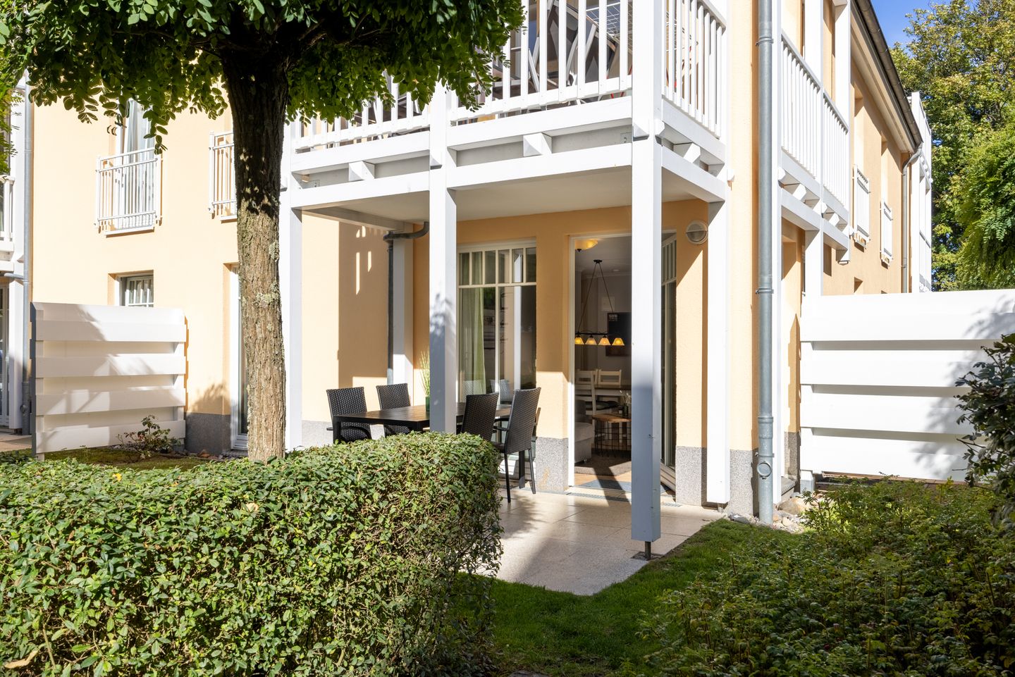 Das Apartment im Erdgeschoss der Ferienanlage zwischen Ostseestrand und Stadtwald befindet sich auf der Südseite, im Haus 2.