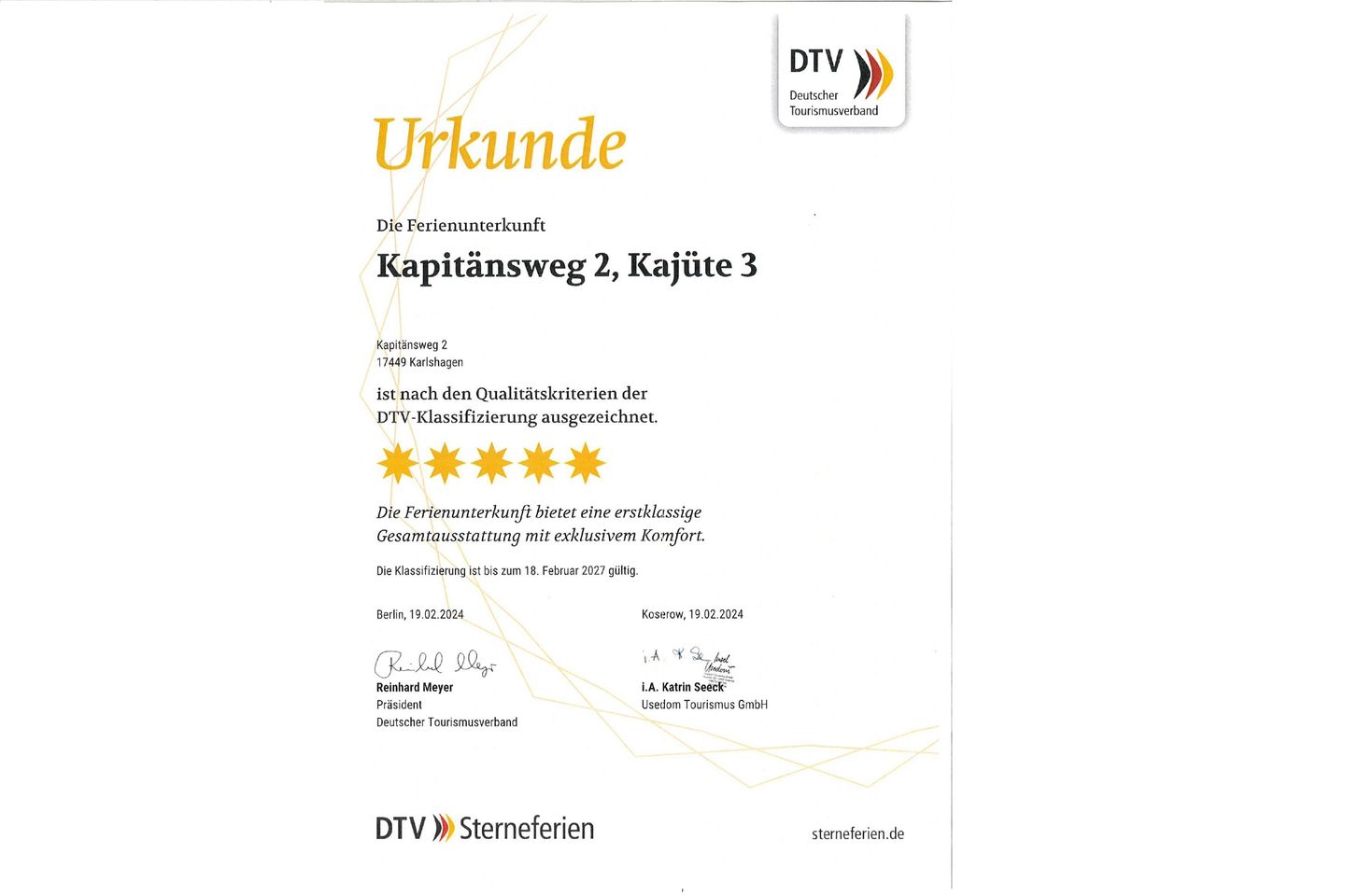 Die Ferienunterkunft ist vom Deutschen Tourismusverband mit 5 Sternen ausgezeichnet – ein verlässliches Zeichen für hohe Qualität, liebevolle Ausstattung und besonderen Komfort.